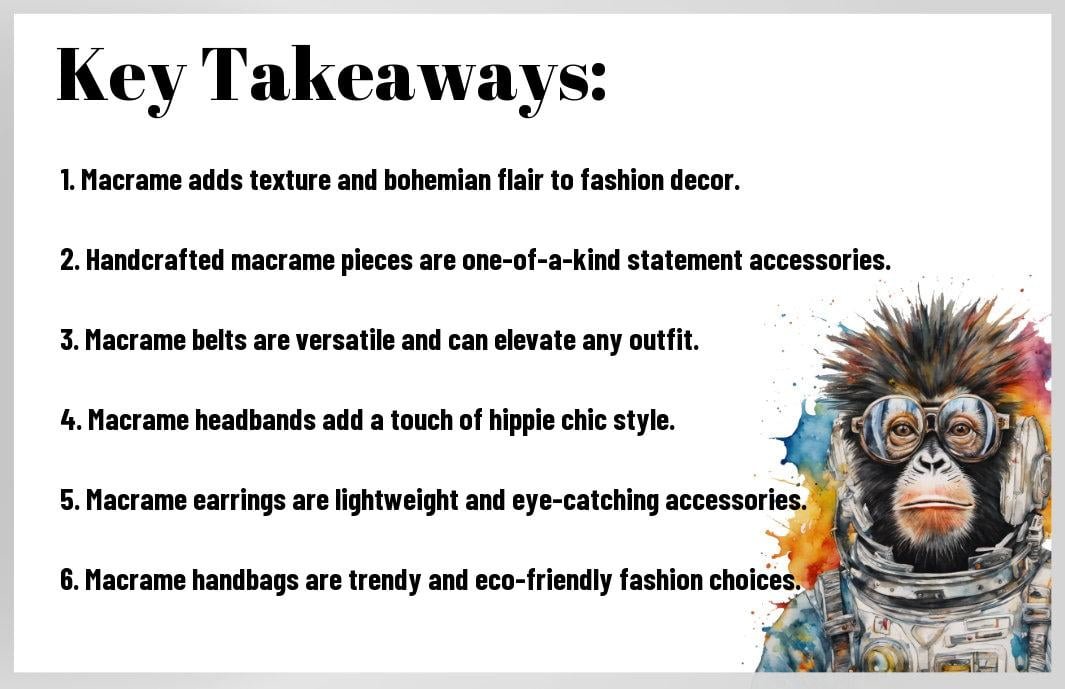 Accessories Incorporating macrame into your accessories and footwear collection is a fun way to add a bohemian flair to your style. Whether you opt for a statement handbag or a pair of unique sandals, macrame pieces are sure to turn heads and spark conversations. Stay ahead of the fashion curve by exploring the world of macrame accessories and footwear to add a touch of artistry and creativity to your wardrobe.