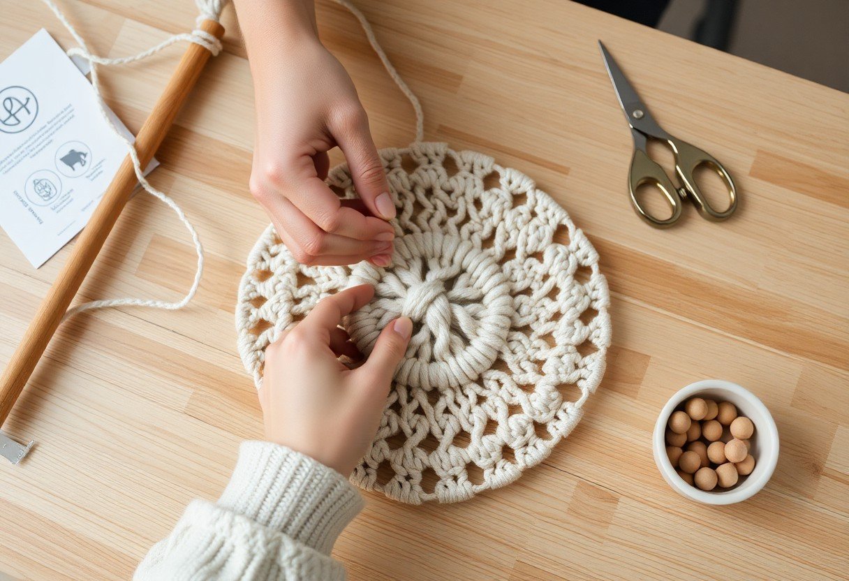 Focus on consistent tension, cord length, and working scale: for coasters you’ll often use 3-5 mm cord and start with 8-12 working strands about 60-80 cm long. Practice mounting cords with a lark’s head and alternate rows of square knots and half-hitches to build stable, absorbent texture; for a beginner project with step-by-step guidance see DIY Macrame Coasters: A Quick and Fun Project for Beginners.