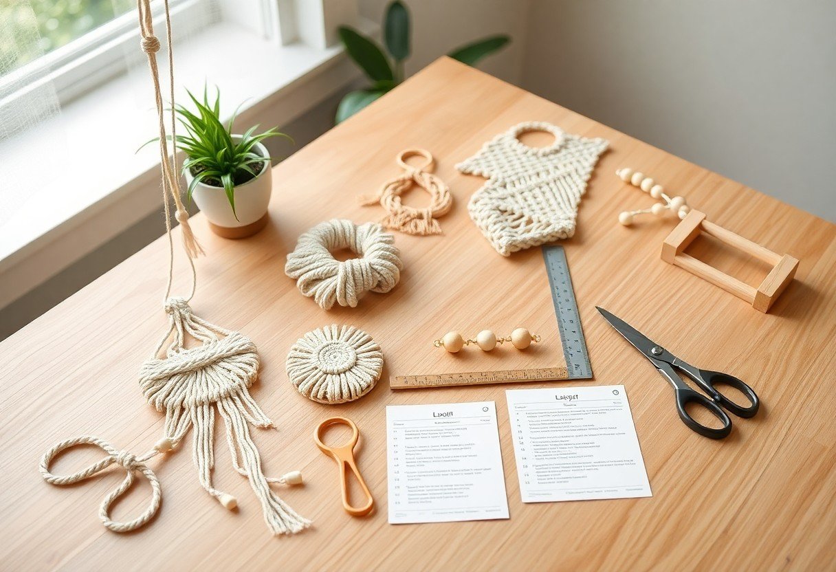 You’ll want 100% cotton macrame cord in 3-5 mm for most beginner projects, plus an alternative like nylon or jute for outdoor pieces. Add a 6-12 mm dowel or 2-4″ metal/wood ring, sharp scissors, a tape measure, binder clips or clothespins, a metal comb for fringe, and a crochet hook or tapestry needle to pull and tighten ends. A small notepad to note cord lengths (see the 4× rule below) saves time and waste.