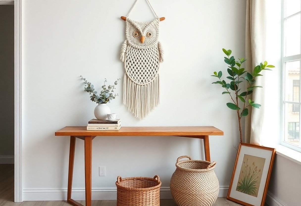 Pair your owl with natural materials-wood frames, woven baskets, and potted plants-to reinforce texture; stick to a 2-3 color palette and mix matte and glossy finishes. You can use a 40×60 cm macramé owl as a focal point flanked by a 50-80 cm mirror or two smaller prints spaced 15-25 cm apart to create a cohesive vignette.