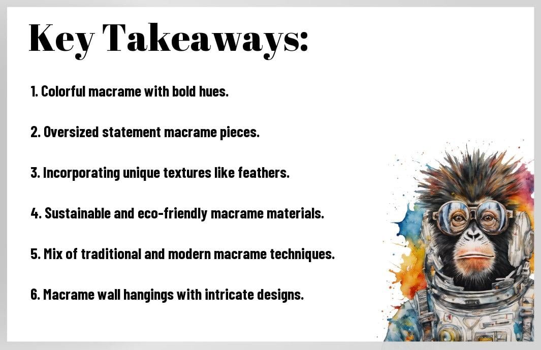 To stay ahead of the curve in macrame design, keep an eye on upcoming color trends and patterns. Earthy tones and neutrals remain popular, but bold, vibrant colors are making a comeback. Incorporating geometric patterns and ombre effects can also elevate the look of your macrame pieces.